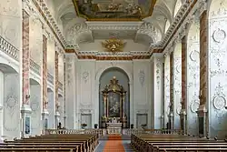 Das ursprünglich 1728 von Cosmas Damian Asam geschaffene Deckengemälde im Langhausgewölbe zeigt den Triumph der Kirche und auf der Chorseite die Heimsuchung Mariens.[3] Es erstreckt sich über 224 Quadratmeter und ist heute eine Nachschöpfung des Kunstmalers Carolus Vocke. Die Scheinkuppeln im Chor, der Altaraufbau und die Musikerempore hinter dem Altar wurden beim Wiederaufbau nicht rekonstruiert.