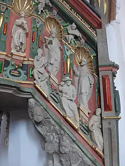 Das Anfang des 17. Jahrhunderts über Varel herrschende Grafenhaus bekannte sich früh zur protestantischen Lehre. In ihrem Geist ließ Graf Anton II. von Delmenhorst, Bruder des herrschenden Grafen von Oldenburg Johann VII., in den Jahren 1613 bis 1618 den Bildhauer Ludwig Münstermann aus Hamburg eine neue Ausstattung im Stil des Manierismus fertigen, die zu den Hauptwerken dieser Stilrichtung in Norddeutschland gehört: das berühmte, aus Eiche geschnitzte Altarretabel, die Kanzel und den Taufstein mit Deckel, die bis heute nahezu vollständig erhalten sind.[3]