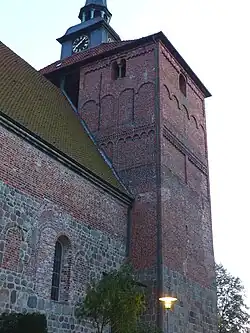 Der breite, gedrungen wirkende Turmbau wurde dem Kirchenschiff in der ersten Hälfte des 13. Jahrhunderts nachträglich als romanisches Westwerk mit einer Doppelturmanlage hinzugefügt, deren erstes Obergeschoss als Herrschaftsloge vorgesehen war; jedoch unterblieb die Öffnung des alten Westgiebels des Kirchenschiffs nach Westen. Um 1600 gingen die hölzernen Turmspitzen verloren, möglicherweise durch einen Sturm. Die verbliebenen Rümpfe wurden erst im 18. Jahrhundert zu der heutigen Form unter einem Dach zusammengefasst. Von 1775 bis 1986 war der Backstein verputzt und der Putz mit einer Quaderritzung versehen. Im Inneren und von Osten kann man noch die beiden Turmstümpfe erkennen, in denen die fünf Kirchenglocken läuten.[2] Der Unterbau der Turmanlage besteht aus der Eingangshalle (mit den beiden einzigen farbigen, modern gestalteten Glasfenstern) und der darüber liegenden Turmloge.