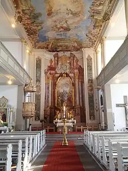 Der Innenraum, 1985/86 restauriert, bietet das Bild eines barocken Festsaals. Dreiseitig umlaufende Emporen mit schlanken Doppelsäulen gliedern den Raum in zwei Geschosse, von denen das untere vorn beidseitig durch Trennwände verkürzt ist, sodass sich der Eindruck einer Dreischiffigkeit mit Chor ergibt. Die Altarwand ist flachoval vertieft. Vor den Grundfarben Weiß und Hellgrau mit goldenen Akzenten an Kanzel, Orgelprospekt und Kapitellen treten Hochaltar- und Deckengemälde in kräftigen Farben hervor.