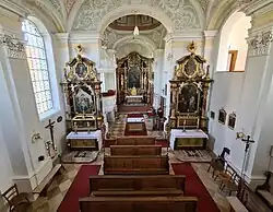 Das Innere des dreijochigen Langhauses und des stark eingezogenen Chors (zweijochig, halbrunder Abschluss) sind reich mit zartem Rokoko-Stuck geschmückt. Stuckarbeiten erfolgten um 1719 durch Nikolaus Liechtenfurtner. Das Deckengemälde im Langhaus stellt Maria Immaculata dar.