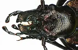 Der Kopf ist im Verhältnis zum Halsschild relativ groß und besitzt große und sehr breite, asymmetrische Mandibeln (Bild 2). Wie bei allen Laufkäfern besteht die Antenne aus elf Gliedern, die ersten beiden sind rötlich gefärbt. Der Halsschild ist breiter als lang, jedoch nur wenig breiter als der Kopf. Die elliptischen Flügeldecken liegen sehr flach auf dem Körper. Auf den Flügeldecken befinden sich in den Primärreihen unregelmäßig angeordnete rotgoldene oder goldgrüne Punktgruben mit großen Grübchen.[1][3] Der vordere Seitenrand ist grünlich.[2]