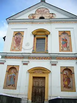 Schlüssel und Schwert sind die Attribute der Heiligen Petrus und Paulus. Das Wappen der Herren von Löwenberg, denen die Freiherrschaft Schleuis gehörte, lieferte die Wappenfarben. |