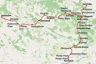 Die Strecke begann am Normalspur-Bahnhof Jędrzejów, von wo aus sie nach Südwesten zum Bahnhof Umianowice führte. Hier befand sich ein Gleisdreieck mit einer Abzweigung nach Pińczów. Geradeaus verlief die Strecke über Hajdaszek und Włoszczowice zum Kreuzungsbahnhof in Bogoria. Dort zweigten zwei Nebenstrecken nach Norden und Osten ab, die nominelle Hauptstrecke führte aber in südlicher Richtung nach Szczucin.[5] Sie überquerte die Weichsel erst auf einer 1925 errichteten Holzbrücke und dann auf einer 1939 errichteten und 1953 neu errichteten Metallbrücke.