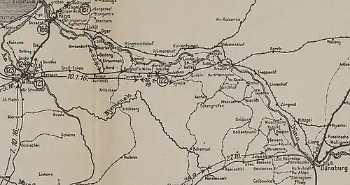 1916 wurde mit tragbaren Gleisjochen eine 100 km lange Feldbahn von Skapiškis in Litauen über Viesīte nach Aldaune (Kaži) verlegt. Kurz danach wurde eine 120 km lange Strecke von Pasmalves (Litauen) über Eglaine nach Siliņi verlegt, wo sie in die Strecke Skapišķi-Aldaune einmündete. Zur gleichen Zeit wurden die Strecken Rokiškis-Aknīste-Geidāni (50 km) und Abeliai-Subate-Kaldabruņa (30 km) gebaut. Die beiden Strecken wurden in Kaldabruņa (Kaltenbrunn) verbunden, wo ein Gleisdreieck zum Wenden der Züge gebaut wurde. Die Stichstrecken Bebrene–Dviete und Zasa–Vandani führten zur Front an der Düna (diese Strecken wurden 1925–1927 abgebaut). In der zweiten Hälfte des Jahres 1916 wurde die Strecke Viesīte-Daudzeva gebaut, und in der Nähe von Daudzeva in Keikani wurde eine Zweigstrecke zum Dorf Sece errichtet.[5]