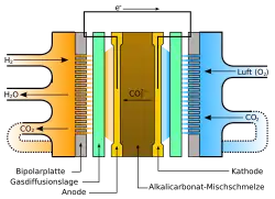 Als Brenngas wird auf der Seite der Anode ein Gemisch aus Wasserstoff und Kohlenmonoxid benutzt, das per interner Reformierung aus einem methanhaltigen Energieträger wie fossilem Erdgas oder Biogas hergestellt wird. Bei der anschließenden Wassergas-Shift-Reaktion entsteht (neben weiterem Wasserstoff) Kohlenstoffdioxid, welches hauptsächlich als Abgas entweicht. Der dort zugesetzte Sauerstoff reagiert unter Reduktion mit dem CO2 aus der Anodenhalbzelle zu Carbonationen, welche durch den Elektrolyten wandern und sich an der Anode mit dem zu oxidierenden Wasserstoff zu Wasser und Kohlenstoffdioxid verbinden. Letzteres wird zur Kathode geführt, so dass sich ein elektrochemischer CO2-CO32−-Kreislauf mit stetiger Wasserstoff- und Sauerstoffzufuhr bildet, bei dem Wasser als Produkt entsteht. Im Gesamtprozess wird damit Methan aus Erd- oder Biogas mittels Luftsauerstoff zu Kohlendioxid und Wasser oxidiert.[2]