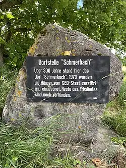 Schmerbach war ein Dorf in der Nähe von Helmershausen in Südthüringen. Der gleichnamige Bach durchfließt das Tal. Aufgrund der lediglich 350 Meter bis zur innerdeutschen Grenze wurde das Dorf mit einigen anderen Höfen in der Region 1974 eingeebnet.