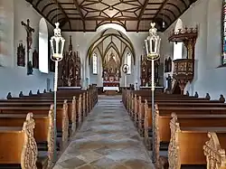 Der Taufstein ist ein kleines Muschelbecken, welches auf einem Rundständer ruht. Die Stuhlwangen sind aufwändig in barocker Manier mit Akanthusranken und Tulpenstäben beschnitzt und stammen aus dem Jahr 1720. Wertvolle Figuren sind die Pietà des Hochaltars, die Mater Dolorosa unter einem Barockkreuz und ein Auferstehungschristus als Salvator, datiert um 1490. Die Kreuzwegreliefs wurden 1904 von dem Regensburger Bildhauer Jakob Helmer gefertigt.[1]
