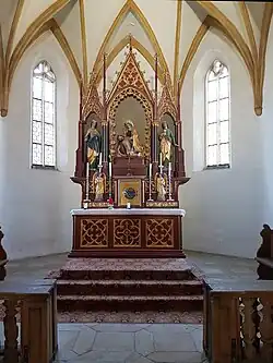 Um 1480 wurde die kleine Kirche durch eine spätgotische Kirche ersetzt, deren Presbyterium erhalten ist. Von der Ausstattung des damaligen Kirchenbaus ist der Hochaltar bis heute bewahrt worden. Mitten im Dreißigjährigen Krieg wurde von 1618 bis 1648 die Raumschale nach Westen hin erweitert. Der jetzige neugotische Turm wurde 1869 vollkommen neu erbaut und ersetzte einen Barockturm. 1904 erfolgte eine Umgestaltung im neogotischen Stil. Dabei entstand das einschiffige Langhaus mit einer Flachdecke aus Holz.[1]