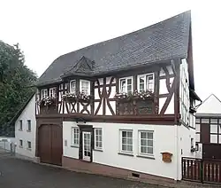 Das dreizonige Fachwerkhaus mit Toreinfahrt hat einen mittleren dreiseitigen Erker und zwei seitliche fränkische Erker. Über dem Eingang ist eine Inschrift und die Jahreszahl 1704 angebracht. Die reichen Schnitzarbeiten an Rahmen und Brüstungen zeigen eine Reihung von Kopfmasken und ein Ornamentwerk aus pflanzlichen und Muschelmotiven.