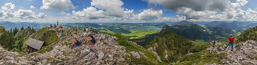 Dem Schobergipfel südlich vorgelagert erhebt sich der Nebengipfel Frauenkopf (1304 m ü. A.) über Fuschl am See.