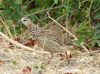 - ↑ Van Niekerk, JH: Social and breeding behaviour of the crested francolin in the Rustenburg district, South Africa. South African Journal of Wildlife Research, Vol. 31, no. 1–2, pp. 35–42. 2001.