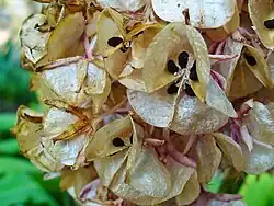 Die pergamentartigen, eiförmigen und im Querschnitt dreikantigen Kapselfrüchte enthalten in jedem Fruchtfach einige Samen. Die glänzend braunen bis schwarzen Samen sind fast kugelig bis eiförmig.[5][6][7][4]
