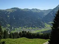Blick von Westen auf Schoppernau mit der Üntschenspitze im Hintergrund | ||
