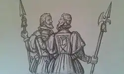 - ↑ Adolphe und Pierre Adolphe Chéruel: Dictionnaire historique des institutions, mœurs et coutumes de la France. Band 1. Hachette, Paris 1855, S. 473. (online). Der Autor benutzt das französische Wort „épée“, das sowohl mit „Schwert“ als auch mit „Degen“ übersetzt werden kann.