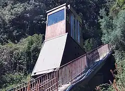Der Schrägaufzug läuft auf zwei Schienen und wird über zwei Stahlseile und eine Umlenkrolle in der oberen Station mit einem Gegengewicht verbunden.