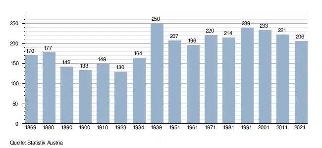 - ↑ Statistik Austria – Bevölkerung zu Jahresbeginn nach administrativen Gebietseinheiten (Bundesländer, NUTS-Regionen, Bezirke, Gemeinden) seit 2002 (ODS)