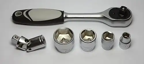 Als Antriebsteil (Ratsche) dient ein Gelenkgriff, Quergriff, Winkelgriff, Kurbel oder Knarre (auch „Ratsche“), in das verschiedene Werkzeugteile eingesetzt werden.