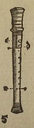 „Schryari (Auff deutsch Schreyerpfeiffen) seynd starck und frisch am Laut/ können vor sich alleine/ und auch zu anderen Instrumenten gebraucht werden; Haben hinten so wol Löcher als fornen; Seynd an der lenge und statur fast den Corna-Musen gleich/ Alleine das (weil sie unten offen und einfach) viel stärcker am Resonanz seyn: Und ob wol zwar der Discant unten zugedeckt ist/ so hat er doch viel neben Löcher/ do der Wind herausser gehen kan. Sie können aber nicht mehr Thon und Stimmen von sich geben/ denn die Zahl der Löcher mit sich bringet.“
