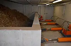 Der Boden besteht aus beweglichen Lamellen, die durch einen hydraulischen Antrieb bewegt werden und das Ladegut vor und wieder zurück befördern können.