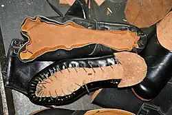 Das für den Schuhbau benötigte Handwerkszeug des Schuhmachers hat sich seit Jahrhunderten kaum verändert. Es wurde lediglich durch rationeller arbeitende Maschinen ergänzt (so erübrigt beispielsweise eine pneumatische Presse das manuelle Anklopfen der Sohle mit Schusterhammer oder Klopfstein). Das Bild zeigt bis auf die Steppmaschine, mit der der Schuhschaft zuvor genäht wurde, sämtliche für die Herstellung eines handgefertigten zwiegenähten Schuhs benötigten Werkzeuge (von links oben nach rechts unten):