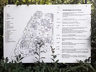 Der botanische Garten hat mehrere Umbenennungen in seiner Geschichte erfahren. Er wurde 1892 auf Initiative des Leipziger Lehrervereins als Botanischer Zentralschulgarten gegründet. Die Fläche betrug damals ca. 3000 m². Er diente als Liefer- und Aufzuchtgarten für die höheren Lehranstalten, aber auch für die Bürger- und Bezirksschulen. Aufzuchtsmöglichkeiten gibt es in Form von Gewächshäusern bis heute. Im Jahre 1911 ging die Verwaltung der Einrichtung an das Schulamt über. In der Weimarer Republik wurde es zum Arbeitsschulgarten entwickelt. Im Zweiten Weltkrieg erlitt der Botanische Garten starke Zerstörungen, auch durch Plünderungen, sodass die Nutzung durch die Schulen rückläufig war. Nach Kriegsende wurde mit dem Neuaufbau begonnen. Der Garten wurde auf eine Fläche von 15 ha erweitert unter Einbeziehung des ehemaligen 1870 durch die Fischerinnung errichteten Germaniabades.[2] Damit ging eine Neuordnung des Gartens einher nach Pflanzenarten. Damit verbunden war ein Neubau eines Gewächshauses für tropische Pflanzen.