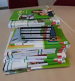 Ein Schulbuch ist ein Druckerzeugnis für die Hand des Schülers, das dazu dient, den Lehrplan eines Faches schulartbezogen in Zielen und Inhalten zu erfüllen.[1] Lehrpläne unterscheiden sich nach Bundesland, Altersstufe und Schulart. In einigen Bundesländern sind neben Druckerzeugnissen auch digitale Medien als Schulbuch möglich.[2] Schulbücher enthalten den Lehrstoff in fachlich korrekter, aber altersgemäßer und didaktisch aufbereiteter Form. Das bedeutet meist eine vereinfachte Darstellung, die wissenschaftlich noch kontrovers diskutierte Fragen der herrschenden Lehrmeinung gemäß darstellt.