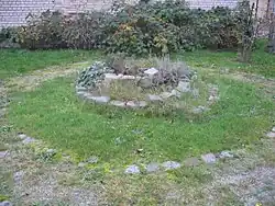 Lage des neuen Schulgartens zwischen der Ortrander Straße 5 und 6 Die Anlage besteht aus einem Kräuterbeet mit Kräuterspirale, das durch einen gewundenen Weg mit einem Heidegarten und Grillplatz / Sitzecke verbunden war. Eine Garagenwand im Westen wird durch eine Beerenhecke abgeschirmt. Mit angelegt wurde ein Volleyballplatz.
