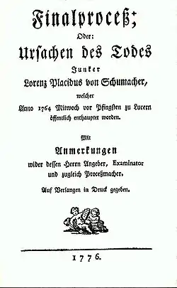 Titelseite einer Publikation von 1776: Ursachen des Todes [von] Junker Lorenz Placidus von Schumacher, welcher Anno 1764 Mittwoch vor Pfingsten zu Lucern öffentlich enthauptet worden. Mit Anmerkungen wider dessen Herrn Angeber, Examinator und zugleich Proceßmacher.