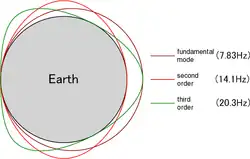 Der mittlere Erdumfang beträgt a = 39.985 km (am Äquator 40.075 km, Polumfang 39.940 bzw. 40.007 km). Bei einer Ausbreitungsgeschwindigkeit des Lichts von c = 299.792.458 m/s (im Vakuum) ergeben sich für den mittleren Erdumfang dabei rechnerisch c/a = 7,5 Hz für die niedrigste Frequenz. Für einen Hohlraumresonator mit ideal leitenden Wänden führen genauere Berechnungen auf die Formel:[1]