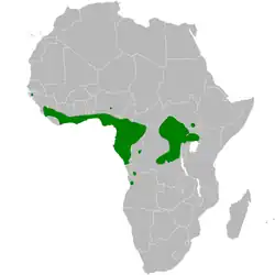 Der Vogel kommt in Zentralafrika vor in Angola, in der Demokratischen Republik Kongo, im Senegal, in Gambia, im Sudan und in Uganda. Der Lebensraum umfasst tropischen oder subtropischen Primär- und Sekundärwald von 900–1850 m Höhe, häufiger im Tiefland. Er ist sowohl im Waldesinneren als auch in Randbereichen zu finden, wenn es Lianen und anderen hängenden Bewuchs gibt, gerne auch an Ufer angrenzend.[3][4][5]