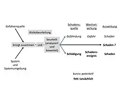 Bei einer Risikobeurteilung werden potenzielle oder tatsächliche Schadensquellen (Gefährdungen[5] bzw. Schädigungen) mit dem betrachteten System und seiner Systemumgebung in Beziehung gebracht und in Bezug auf potenzielle oder tatsächliche unerwünschte (unfreiwillige und nachteilige) Wechselwirkungen (Gefahren bzw. Schadensereignisse) und ihre potenziellen oder tatsächlichen Auswirkungen (Schäden) hin untersucht und bewertet (Bild 1).