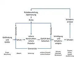 Schutz und Sicherheit sind bei Entwurf oder Analyse eines Systems gemeinsames Ziel einer Risikobeurteilung.[3][4] Ausgangspunkt einer Risikobeurteilung ist die Annahme von Gefahrenquellen. Dabei ist eine Gefahrenquelle der potenzielle oder tatsächliche Ursprung für eine unerwünschte (unfreiwillige und nachteilige) Wechselwirkung eines betrachteten Systems mit seiner Systemumgebung oder innerhalb dieses Systems. Die Berücksichtigung einer solchen Wechselwirkung bei einer Risikobeurteilung macht aus einer Gefahrenquelle eine Schadensquelle. Schaden wiederum ist eine unerwünschte (unfreiwillige und nachteilige) Veränderung des Zustands oder einer oder mehrerer Funktionen eines Systems oder der Systemumgebung, auch Veränderung einer oder mehrerer vorhandener, aber nicht genutzter Funktionalitäten eines oder mehrerer Systemelemente.