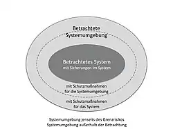 Die eingetragenen – beispielhaften, nicht abschließend ausgewiesenen – Sicherheits- und Schutzbegriffe beziehen sich insbesondere auf industrielle und gesamtgesellschaftliche Aspekte. Ihre jeweilige Position ist dabei allerdings nur als angenähert anzusehen. Dabei erfordern sowohl der Schutz der Außenwelt vor dem System als auch der Schutz des Systems vor der Außenwelt einen erweiterten Blick auf die Systemgrenze. Innerhalb des Betrachtungsbereichs (der eigentlichen Systemgrenze) sind Schutzgrenzen und die sichtbare / konstruktive Systemgrenze (auf unterschiedliche Weise) unterbrochen gezeichnet, nicht nur um die einzelnen Grenzen zu unterscheiden, sondern auch weil die Abgrenzung zwischen den primären Systemelementen und den Schutzelementen des Systems schwierig sein kann und der Übergang vom Schutz innerhalb des Systems zum Schutz von System und Systemumgebung gegeneinander fließend sein kann. Einige Begriffe sind mehrfach eingetragen, da sie sowohl den Schutz der Systemumgebung gegen das System wie auch den Schutz des Systems gegen die Systemumgebung betreffen können oder auch Sicherungselement innerhalb des Systems sein können.
