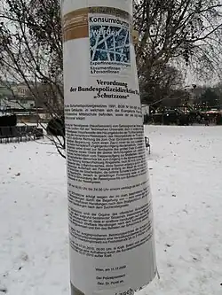 Im ersten Absatz wird geregelt, dass die Sicherheitsbehörde einen bestimmten Ort, an dem überwiegend Minderjährige von den Auswirkungen gerichtlich strafbarer Handlungen bedroht sind, mittels Verordnung zur Schutzzone erklären kann. Als geeignete gerichtlich strafbare Handlungen, die die Einrichtung einer Schutzzone rechtfertigen, werden durch das Gesetz solche nach dem Strafgesetzbuch, dem Verbotsgesetz und insbesondere dem Suchtmittelgesetz bezeichnet. Weiters wird festgelegt, dass die Schutzzone ein Schutzobjekt, wie etwa eine Schule, einen Kindergarten oder ein Kindertagesheim, sowie einen Bereich im Umkreis dieses Schutzobjekts umfasst.[1] Der genaue Bereich, der nicht mehr als 150 Meter im Umkreis um das Schutzobjekt reichen darf, wird von der Sicherheitsbehörde mittels Verordnung festgelegt.