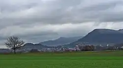 ![]() Albtrauf, Mittlere Schwäbische Alb, gesehen vom Osthang (575 m) des Jusibergs (672,6 m). Die Orte sind Neuffen und Beuren. Den Albtrauf bilden Hohenneuffen (745,4 m), Bassgeige (735,6 m), westlich von Beuren der Engelberg (527,2 m) und weiter hinten der Teckberg (774,8 m) mit vorgelagertem Schwäbischen Vulkan Hohenbol (602,2 m). Am Albtrauf liegt ausladender Hangschutt. Das Vorland mit den beiden Orten ruht auf Schichten des Braunen Jura. | |