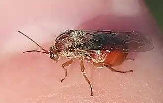 Die Imagines der geschlechtlichen Generation besitzen eine Körperlänge von 1,7–2 mm. Die Männchen haben einen dunkelbraun bis schwarz gefärbten Kopf und Thorax. Der Hinterleib ist schwarz. Die Beine sind gelb-braun. Die Weibchen der geschlechtlichen Generation sind vollständig dunkelbraun gefärbt.