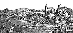 Anhand der ältesten erhaltenen Abbildung der Stadt, einer Federzeichnung Wilhelm Dilichs von 1627, lässt sich das ursprüngliche Stadtbild erahnen. Am Ende der Oberen Schloßstraße steht an exponierter Stelle das kurfürstliche Jagdschloss, das seine heutige Gestalt 1852 erhielt. Am anderen Ende der Straße ist der Dachreiter des Rathauses auf der Ostseite des Marktes zu erkennen. Das dritte auffällige Gebäude im historischen Stadtkern war die Kirche, die im 17. Jahrhundert zu klein und durch die St.-Georgen-Kirche ersetzt wurde. Neben der alten Kirche befand sich der Friedhof an der Stelle, die heute als Unterer Markt bezeichnet wird. Bald wurde auch der Gottesacker zu klein und durch einen zweiten, außerhalb der Stadtmauern, entlastet und später ganz ersetzt. Von den Stadtmauern selbst ist bereits auf Dilichs Zeichnung nichts mehr zu sehen. Bis heute haben sich lediglich die Bezeichnungen Oberes Tor und Unteres Tor erhalten. Als die Gebäude innerhalb der Stadt für die stetig wachsende Bevölkerung nicht mehr ausreichten, errichtete man Häuser auch außerhalb der Stadtmauer. Auf der oben genannten Zeichnung lassen sich unterhalb der Kirche die Gebäude der Vorstadt erkennen.