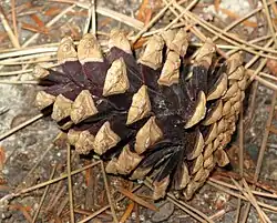 Die weiblichen Blütenzapfen sind kurzgestielt und stehen in Gruppen von zwei bis vier. Sie sind anfangs grün, verfärben sich aber bis zur Bestäubung karminrot.[4] Die 3,5 bis 12 Zentimeter langen und 2 bis 4,5 Zentimeter dicken Zapfen reifen im Herbst des Folgejahres. Sie sind ungestielt oder kurzgestielt und zur Reife glänzend bräunlich-gelb bis hell-braun. Vom Zweig stehen sie rechtwinkelig oder in einem leicht schrägen Winkel ab. Die Zapfenschuppen sind stark verholzt und sind 2,5 bis 3 Zentimeter lang. Die verdeckten Teile der Zapfenschuppen sind schwarz gefärbt, wodurch sich die Schwarzkiefer von anderen südeuropäischen Kiefernarten unterscheiden lässt.[4]