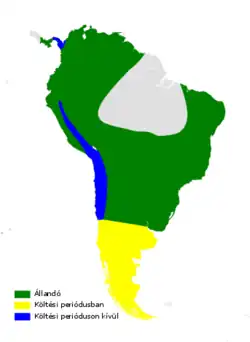 - Pygochelidon cyanoleuca patagonica d’Orbigny & Lafresnaye, 1837[10] Steuerfedern, Schwungfedern und große Flügeldecken sind schwärzlich, wobei der Schaft bräunlich ist. Die äußeren Steuerfedern sind dünn weiß gesäumt. Die Unterflügeldecken und Achselfedern sind mausgrau. Die Unterschwanzdecken sind weiß. Die Unterart ist etwas größer als die Nominatform. Immature sind farblich den ausgewachsenen Vögeln sehr ähnlich.[11] Kommt vom Zentralchile über Zentralargentinien und südlich bis Isla Grande de Tierra del Fuego, dabei ziehen sie nach Nordchile und östlich bis in die Anden Venezuelas und nach Panama. Irrflieger finden selten sogar den Weg bis Mexiko. Man trifft sie nicht in typischer Punalandschaft.[2]