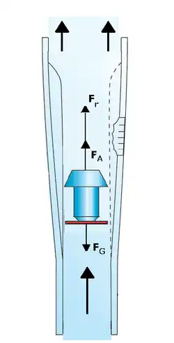 Ein Schwebekörper-Durchflussmesser besteht aus einem konischen Rohr, das von unten nach oben vom Fluid durchströmt wird. In diesem Konus befindet sich ein vertikal beweglicher Schwebekörper. Dieser hat im fließenden Fluid einen Strömungswiderstand, das heißt, es wirkt auf ihn eine Kraft in Richtung der Strömung, die abhängig von der Strömungsgeschwindigkeit, der Schwebekörperform und den Messstoffeigenschaften (Dichte, Viskosität) ist. Gleichzeitig erfährt der Schwebekörper einen statischen Auftrieb , der der Gewichtskraft entgegenwirkt.