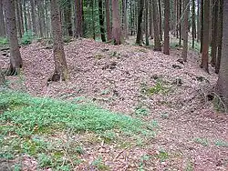 Im Südosten des Kernwerkes laufen zwei kurze Grabentraversen den Hang hinunter zur Talsohle. Die dahinter aufgeschütteten Wallzüge sind nur maximal 1,5 Meter hoch. Der südliche Wallgraben setzt sich auf der Hochfläche als Frontwall fort. Der zugehörige Graben ist hier stellenweise noch etwa zwei Meter tief. Ungefähr zwei Meter unter dem Plateau läuft ein verschütteter Hanggraben oder eine Berme um die Nord- und Westseiten des Hauptwerkes. Kurz vor der südwestlichen Hangkante geht diese Geländestufe in die natürliche Böschung über. Im Süden sind keine eindeutigen Erdwerke feststellbar Der Hang scheint hier weitgehend unberührt zu sein.