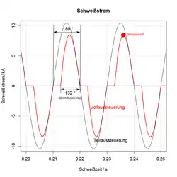 Merkmale, die aus dem Strom beim Wechselstromschweißen gewonnen werden können, sind der Spitzen- oder Scheitelwert und der Effektivwert. Beim Wechselstromschweißen wird der Strom durch Phasenanschnitt verändert. Die Zeitdauer des tatsächlichen Stromflusses pro Halbwelle wird als Stromflusszeit in ms oder bezogen auf die ganze Halbwelle von bei bzw. bei als Stromflusswinkel in ° (Grad) bezeichnet.[9] Durch die Induktivität des Sekundärkreises ergibt sich zwischen Spannung und Strom eine Phasenverschiebung mit einem Lastwinkel . Daraus berechnet sich die Wirkleistung zu . Die Größe des Leistungsfaktors wird im Wesentlichen durch die Fensteröffnung des Sekundärkreises der Schweißzange bestimmt. Alle genannten Größen kommen für die Überwachung des Wechselstromschweißens in Betracht.
