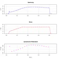 Beim Schweißen mit allen Stromarten ist die Erwärmung und Verbindungsbildung und letztlich die Größe der Schweißlinse von der zeitlichen Entwicklung der Widerstandsverhältnisse während der ablaufenden physikalischen Prozesse an der Schweißstelle abhängig. Die Linsenbildung spiegelt sich deutlich im sogenannten dynamischen Widerstand wider.[10] Er hängt außer von der Werkstofftemperatur auch von der Material- und Oberflächeneigenschaften der Fügepartner ab.