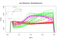 Visualisierung des Sollbereiches vom dynamischen Widerstand nach der Trainingsphase (grüner Bereich) mit vier Subklassen (Profilplot), Lernobjekten für jede Subklasse (farbige durchgezogene Linien) und einer Beispielschweißung (blaue Linie) mit dem System PQS-RES der HWH-QST GmbH[17] -