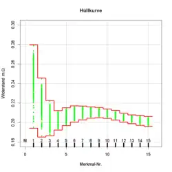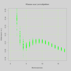 Nebenstehendes Bild zeigt ein Beispiel der Klassenbildung beim Widerstandspunktschweißen. Die Merkmale sind Abtastwerte des dynamischen Widerstandes. Die Klassen werden aus Beispielobjekten gebildet. Nach weiterem Schweißen zeigen sich neue, außerhalb der Klasse liegende Objekte, die nach einer Prüfung für gut befunden werden. Die Objekte werden zur Klasse hinzugefügt. Die Klasse wird breiter. Bei Anwendung der Klassenbeschreibung durch Hüllkurven verschlechtert sich die Klassifizierung. Die Klasse wird durch k-means-Clusterung in zwei Subklassen aufgespalten, die getrennt durch Hüllkurven beschrieben und zur Klassifizierung genutzt werden.