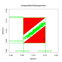 Korrelierende Merkmale haben für die Klassifikation keine zusätzliche Information. Korrelation zwischen Merkmalen führt zu gedreht liegenden Klassen im Merkmalsraum. Die Drehung wirkt sich auf die Klassierung ungünstig aus. Wenn die Klasse z. B. durch scharfe, achsparallele Grenzen beschrieben wird, führt das dazu, dass sich der Gültigkeitsbereich auch in die Ecken des umschriebenen Rechtecks erstreckt (rote Flächen in nebenstehendem Bild). Diese Bereiche liegen jedoch tatsächlich außerhalb der Klasse, denn die Klasse wird nur durch die grün dargestellten Objekte repräsentiert. Objekte mit Merkmalswerten innerhalb des roten Bereiches (blaue Objekte) werden fälschlicherweise als zur Klasse gehörend angesehen. Das kann durch Klassenbeschreibungen, die diese Klassendrehung berücksichtigen (z. B. Kerndichteschätzung oder Fuzzy-Pattern-Klassenbeschreibung) vermieden werden. Möglich ist auch eine Merkmalsvorbehandlung, die eine Transformation der Merkmale in der Weise vornimmt, dass Korrelation vermieden wird (Hauptkomponentenanalyse, Diskriminanzanalyse oder Unabhängigkeitsanalyse).