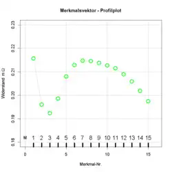 Beispiel: Eine Widerstandspunktschweißung wird durch die Messgrößen Spannung und Schweißstrom charakterisiert. Die Erwärmung der Bleche und damit die Größe des entstehenden Schweißpunktes spiegelt der Widerstand wider. Da sich beide Größen während der Verbindungsbildung ändern (dynamischer Widerstand), soll der Widerstandsmittelwert aus den Effektivwerten beider Größen berechnet werden. Diese skalare Größe repräsentiert in diesem Falle das Objekt „Widerstandsschweißpunkt“. Für eine genauere Betrachtung kann man die Auflösung der Messung erhöhen und mittlere Messwerte der elektrischen Größen über ein Zeitfenster (z. B. alle 20 ms) nutzen, aus denen jeweils der Quotient gebildet wird. Es ergibt sich eine Folge von Messwerten, deren Komponenten als Merkmalsvektor aufgefasst werden kann. Er ist grafisch durch eine Profildarstellung visualisierbar.