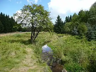 Sie entspringt nordöstlich des Brandhübels (780,90 m) bei Klíny (Göhren) im böhmischen Teil des Erzgebirges und fließt durch das Moorgebiet des Schwarzen Teiches (Černý Rybník) zunächst in südwestliche Richtung; nach einem Kilometer trifft sie auf die Grenze zu Sachsen und bildet dann auf ihrem gesamten Verlauf die Landesgrenze zwischen Sachsen und Tschechien.