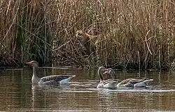 In den Schilfröhrichten des Gebietes wurde die an Schilf gebundene Fauna untersucht. Die lokal häufige Zweipunkt-Schilfeule (Archanara geminipunctata) bewirkt in den befallenen Halmen ein markant vermindertes Höhenwachstum. Die Halmfliegen-Gattung Lipara, nachgewiesen mit Lipara rufitarsis und Lipara lucens erzeugt die für die Gattung charakteristischen zigarrenförmigen Pflanzengallen. Als Inquiline in den Gallen ist eine andere Halmfliege, Cryptonevra flavitarsis, häufig, die die Gallen nutzt, ohne sie selbst erzeugen zu können. Die Gallmücken Giraudiella inclusa, Lasioptera flexuosa und Lasioptera arundinis bilden unauffälligere Gallen im Inneren der Halme. Raupen der Grasglucke Euthix potatoria fressen an den Blättern. Die typischen Schilf-Zikadenarten Chloriona dorsata, Chloriona smaragdula, Chloriona vasconica und Euides speciosa saugen Pflanzensaft aus dem Phloem der Blätter.[2]